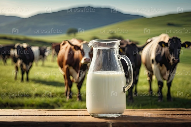 Свежее деревенское коровье молоко в кружке на столе на фоне луга, где пасутся коровы