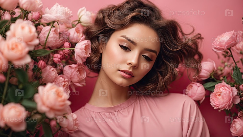 Молодая женщина с кудрявыми волосами и розовыми розами в студии, весенняя цветочная красота, нежный женский стиль, День женщины