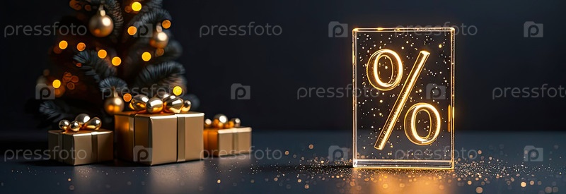 Неон светящийся золотой процентный знак на рождественском фоне с елкой, блесками и коробками для подарков. Черная пятница, Новый год, Рождественская распродажа, скидки. баннер, флаер с копировальным пространством. ИИ генерируется