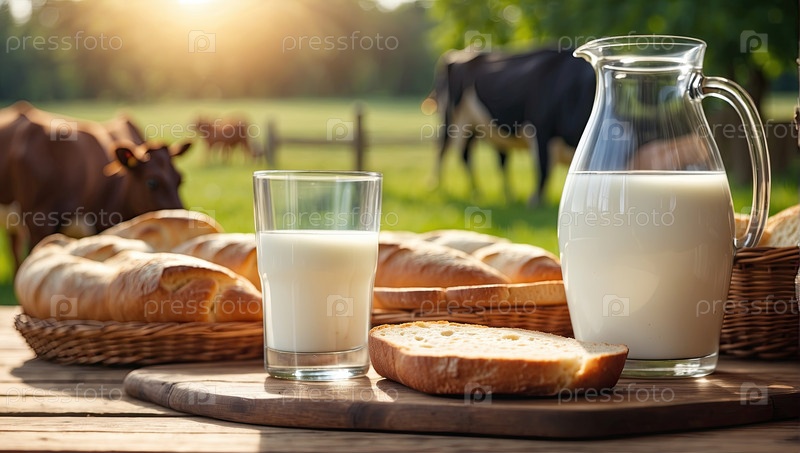 Свежее деревенское коровье молоко в кружке и белый ароматный хлеб и выпечка на столе на фоне луга, где пасутся коровы