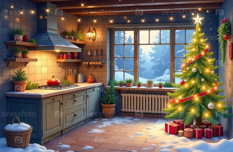 Рустический интерьер уютной рождественской кухни, новогоднее настроение, подготовка к празднику, посуда. Рождественский декор снежной кухни с приготовленным ужином. ИИ генерируется