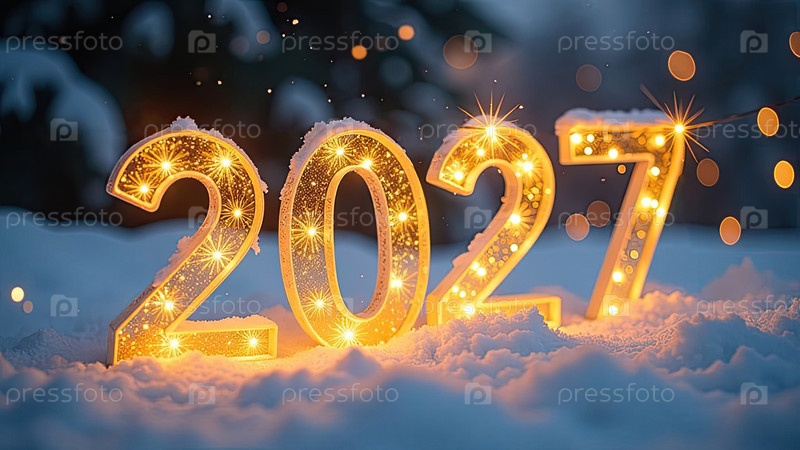 Прозрачные золотые светящиеся числа 2027 на снежном фоне Нового года с золотистыми гирляндами боке, секины, звезды, снег, блеск. Поздравления, открытка. Календарь, обложка. AI generated