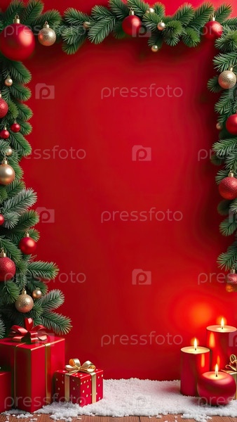Рождественские поздравительные открытки приглашение с пространством для текста в рамке на красном фоне со светящейся елкой и гирляндой, шарами, подарочными коробками