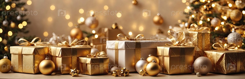 Рождественский фон с подарочными коробками с луками в ярких золотых тонах, боке и фейри-светом, рождественская елка во внутреннем интерьере дома. праздничное настроение Рождество и Новый год, баннер. ИИ генерируется