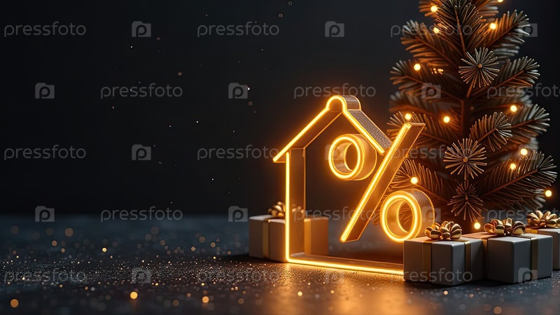 Прозрачный золотой светящийся символ процент в доме на рождественском фоне с золотистым блеском. черная пятница, скидка, купон, покупка, продажа, риэлтор, ипотека, страхование, бронирование. ИИ генерируется