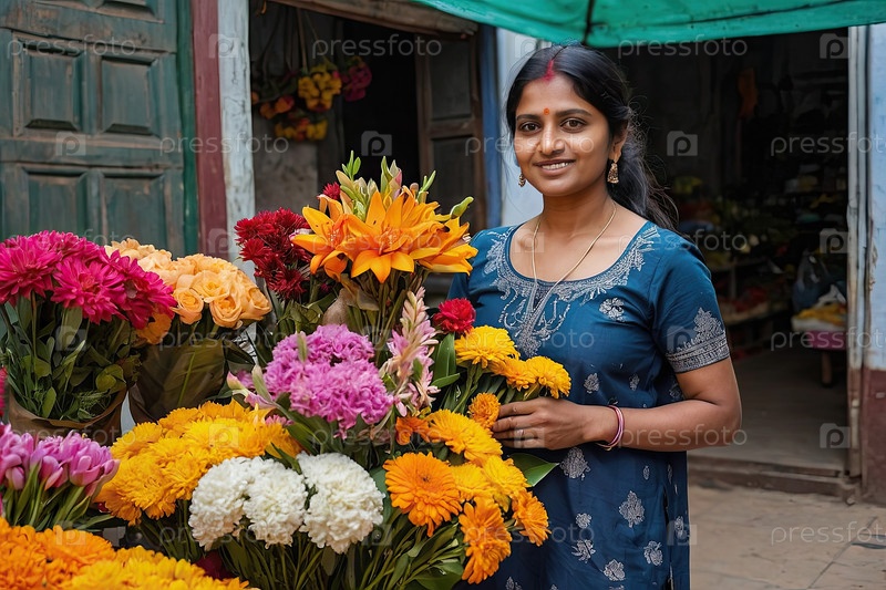 Индийская цветочная девушка с желтыми хризантемами и белыми розами, устраивающая букет для Ракша-Бандана и свадеб