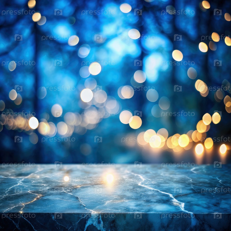 Светлая мраморная столешница на синем фоне боке с теплыми огнями