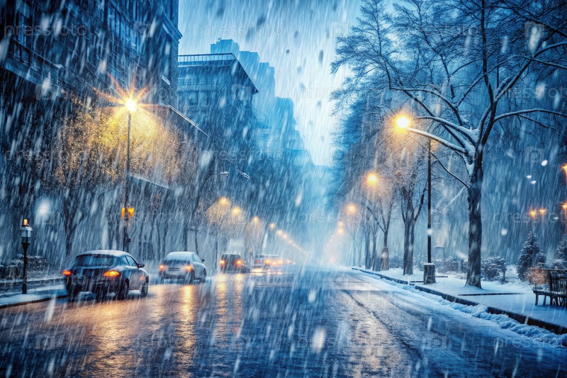 Снежная городская улица во время зимней бури