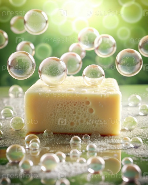 Сливка мыла с пузырями, окруженная зелеными листьями