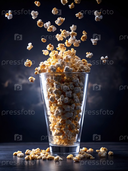 Сверхглавное изображение попкорна, падающего в стакан