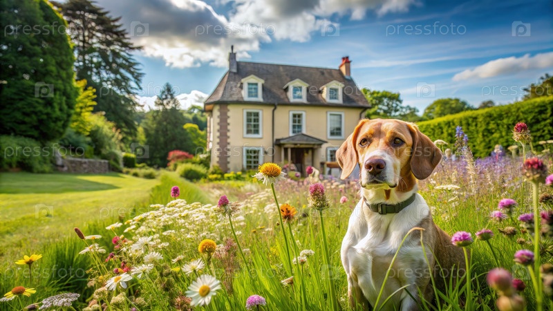 Собака, сидящая на поле цветов перед загородным домом