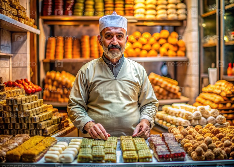 Турецкий продавец сладостей устраивает баклаву на рынке