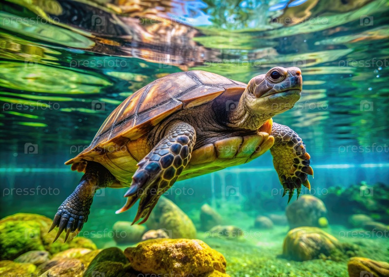 Желтая черепаха плавает под водой на выставке в зоопарке