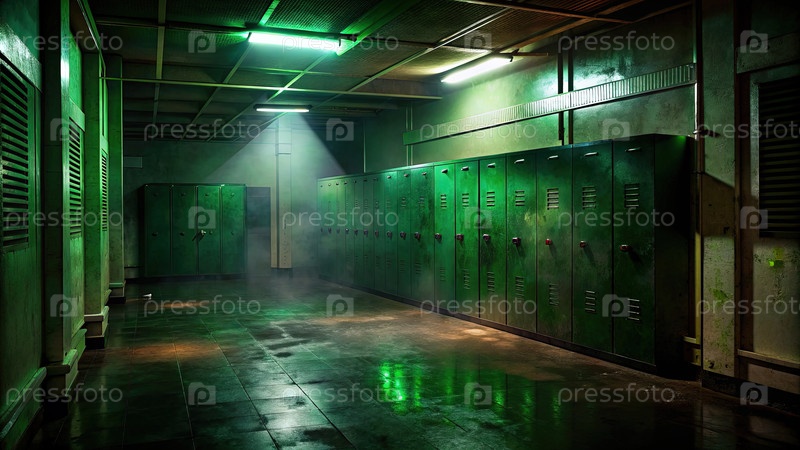 Зеленое освещение школьного шкафчика в коридоре с туманом и отражениями