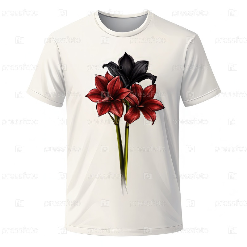 Белая футболка с черно-красной иллюстрацией силуэта цветка амариллы. генеративный AI