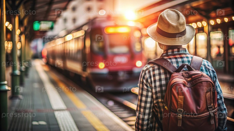 Путешественник, ожидающий на платформе железнодорожного вокзала в течение Золотого часа