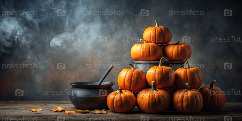 Куча тыквы сидит на черном котле с дымом