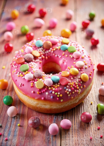 Розовый пончик с красочными конфетами на деревянном столе