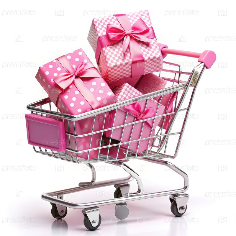 Розовая корзина с подарками на белом фоне