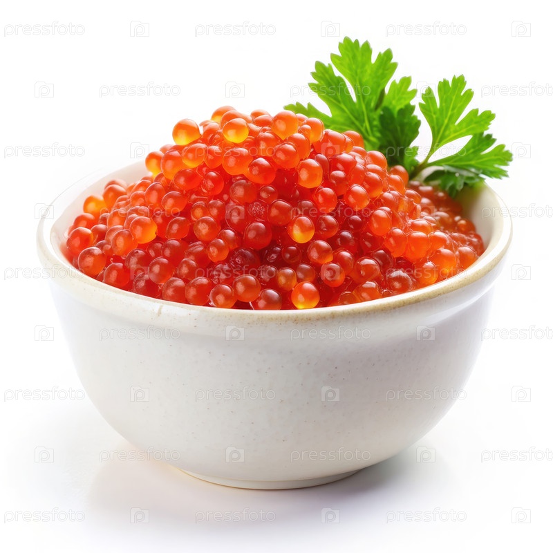 Красная икра в белой миске с петрушным гарниром