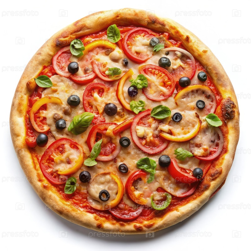 Вкусная овощная пицца с помидором, базиликом и оливками