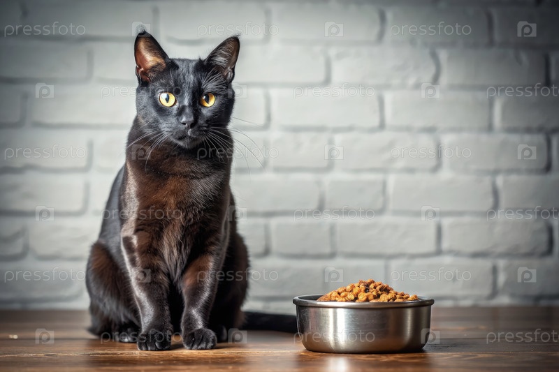 Черная кошка сидит возле миски с сухой едой перед кирпичной стеной