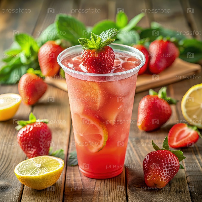 Освежающий напиток из клубничной лимонады с лимоном и мятой на деревянном столе