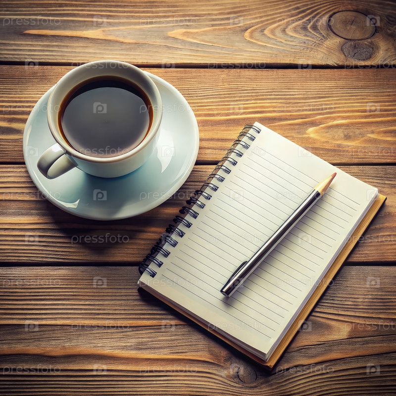 Чашка кофе и блокнот готовы к написанию на деревянном столе