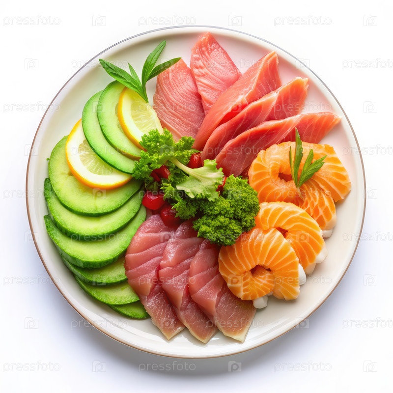 Свеже нарезанный тунец, лосось и креветки с авокадо на белой тарелке