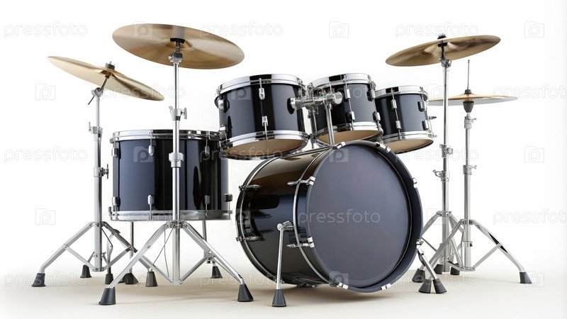 Черный барабан, установленный на белом фоне с цимбалами