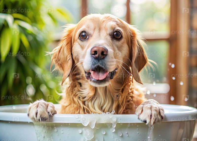 Собака, сидящая в ванне с проточной водой. генеративный ИИ