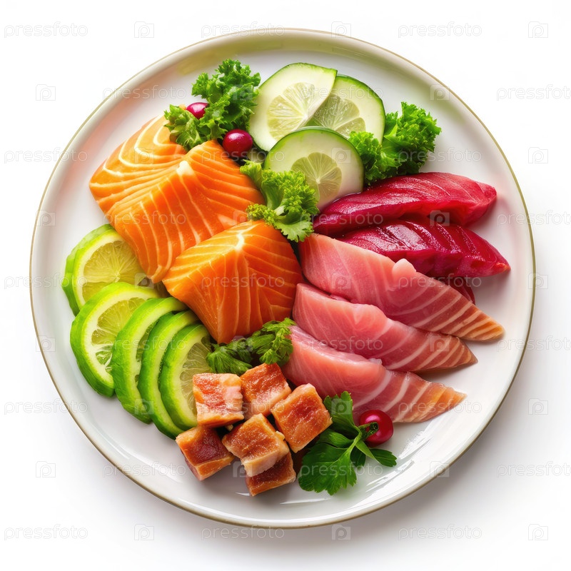 Тарелка сашими с тунцом, лососем и креветками, украшенная авокадо и огурцами