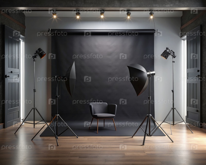 Минималистская черная фотостудия с двумя огнями и стулом. генеративный ИИ