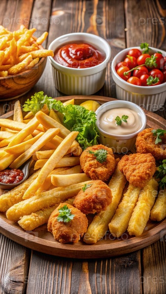 Хрустящая жаренная рыба и картофель фри на деревянной тарелке с соусами