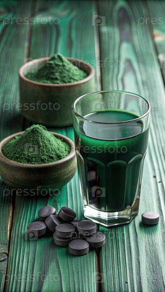 Порошок спирулины, таблетки и напиток на зеленой деревянной поверхности. генеративный ИИ