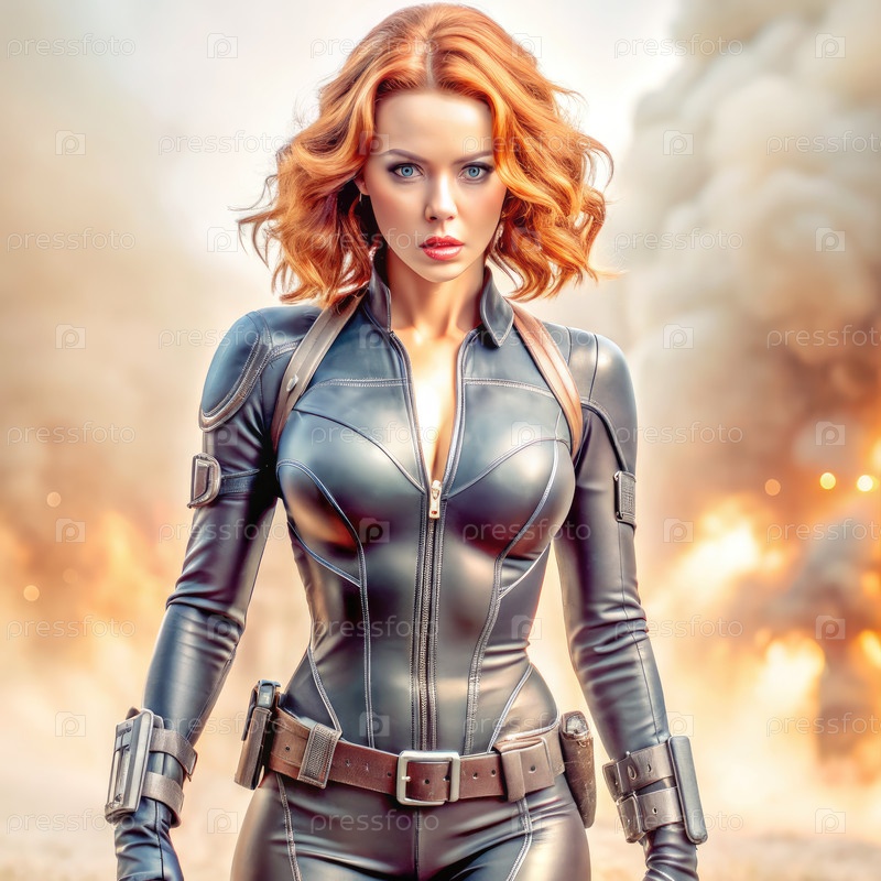 Черная вдова в кожаном костюме стоит перед огненным взрывом