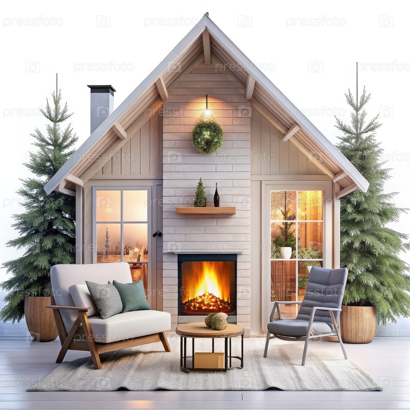 Уютный скандинавский зимний домик на террасе с камином и вечнозелеными деревьями