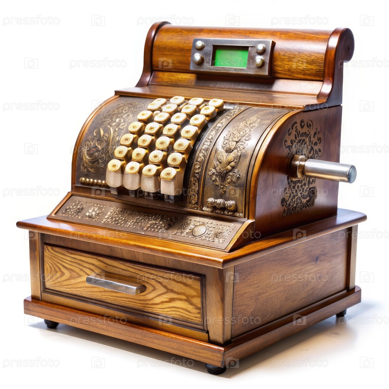 Древний деревянный кассовый регистр с ящиком и ключами на белом фоне