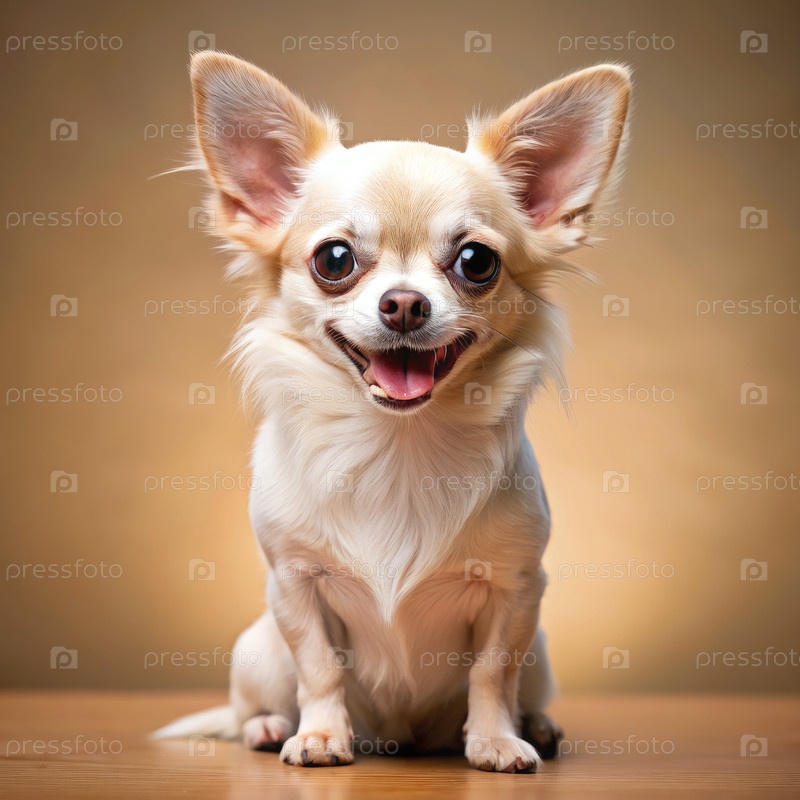 Улыбающийся белый чихуахуа сидит на деревянной поверхности