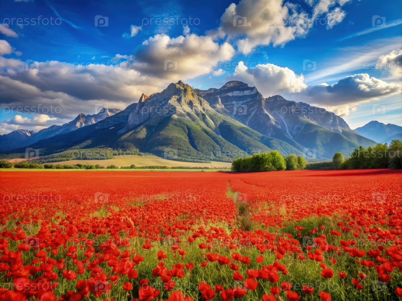 Поле красных маков перед величественными горами