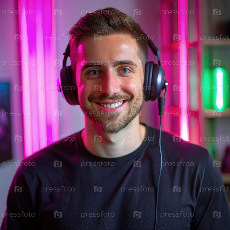 Улыбающийся геймер, носящий наушники в комнате с неоновыми огнями
