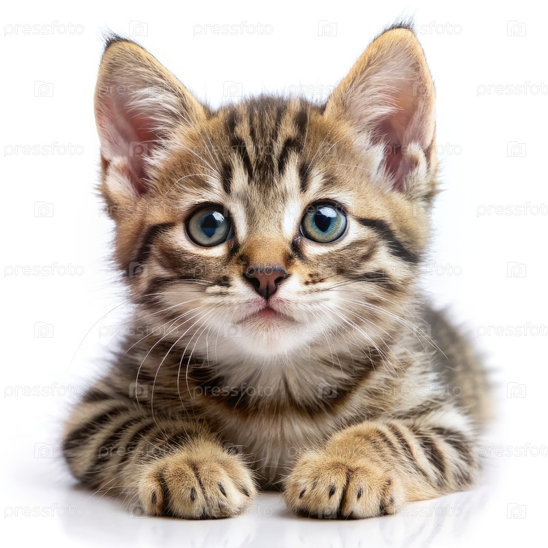 Очаровательный котенок Табби лежит на белом фоне