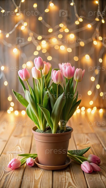 Розовые тюльпаны в терракотовом горшке на деревянном полу со струнными огнями