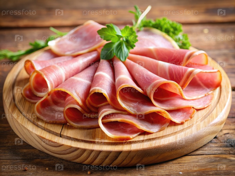 Тонко нарезанная ветчина на деревянной доске