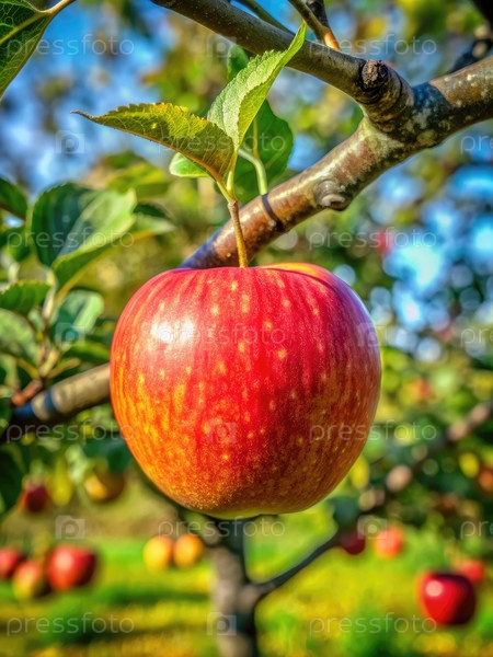 Зрелое красное яблоко висит на ветке в солнечном саду