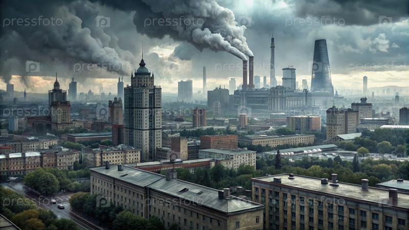 Советский город под облачным небом с дымовыми сливами, восходящими из большого промышленного комплекса