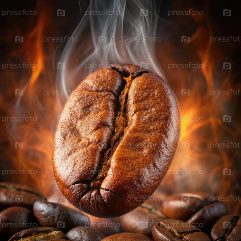 Ближайшее изображение одного жареного кофейного зерна с дымом и огнем на заднем плане