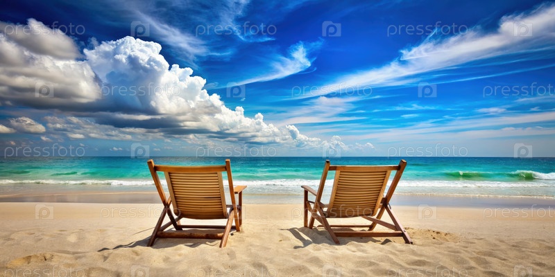 Два деревянных пляжного кресла, обращенные к океану в солнечный день