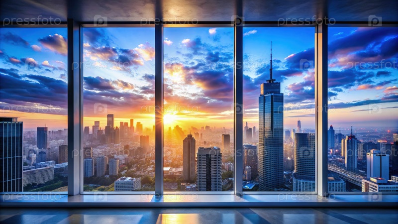 Потрясающий восход солнца над городским пейзажем, рассматриваемым из окна
