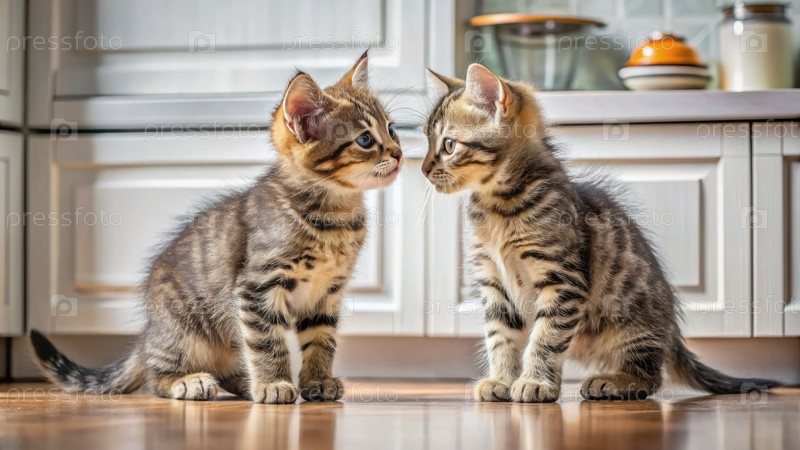 Два котенка Тэбби противостоят друг другу в куточке кухни